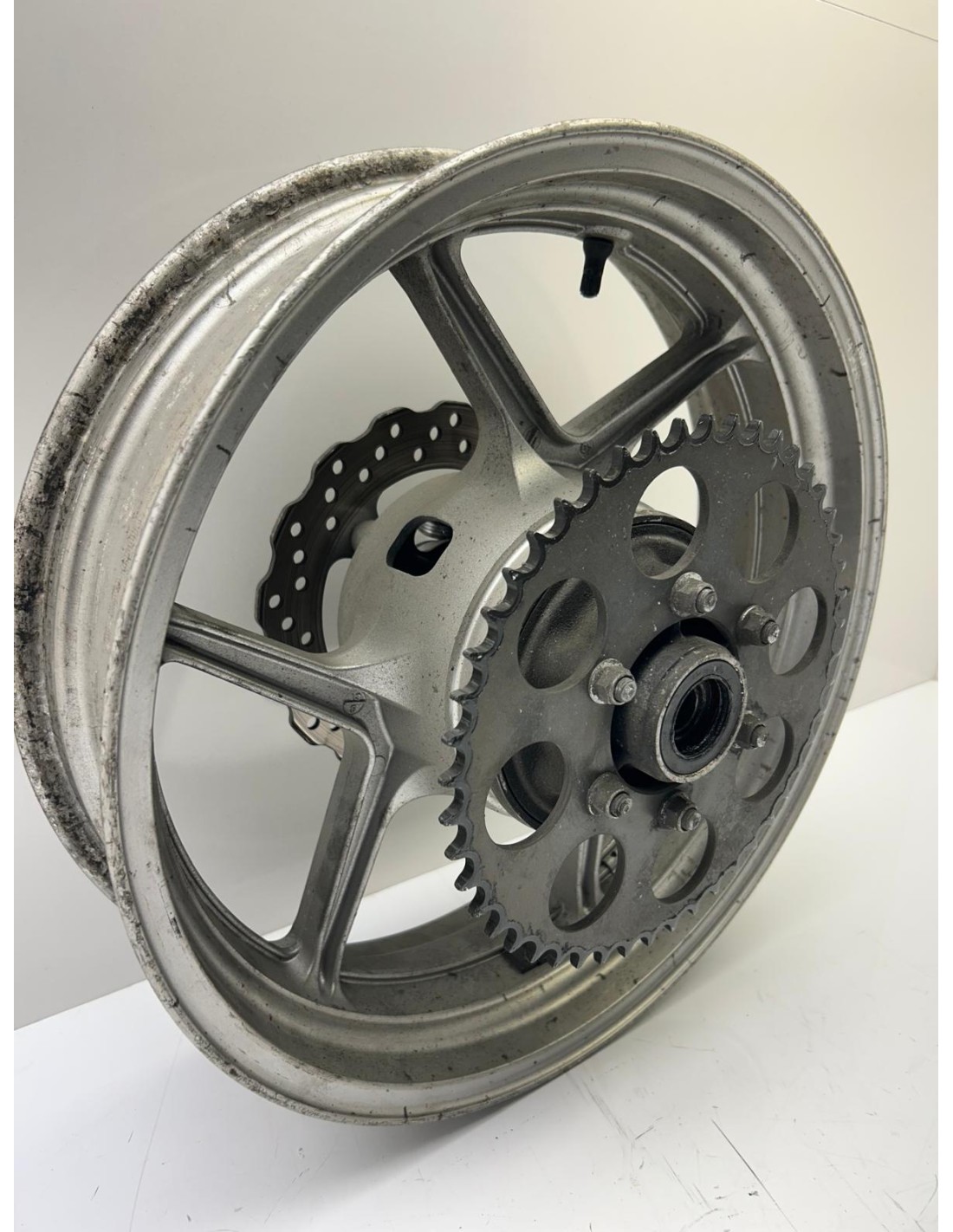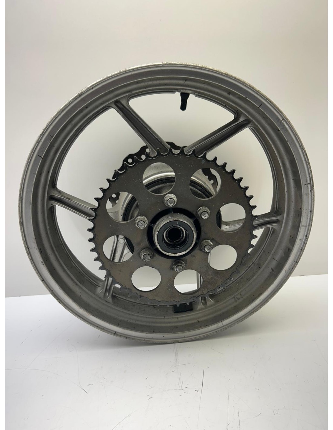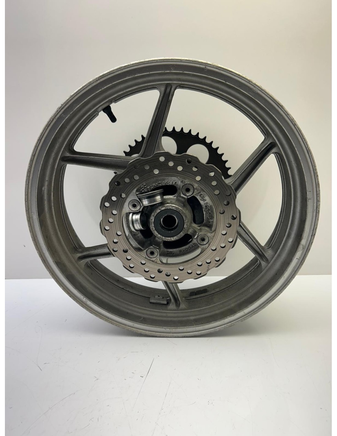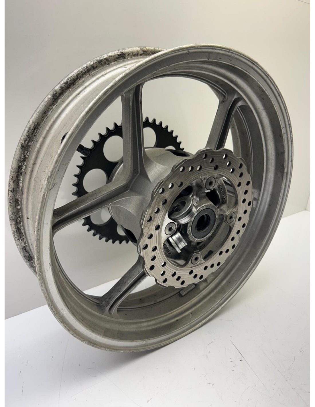 Jante arrière grise avec porte couronne et disque. ER6-N 2006 2007 2008. Occasion bon état. Monte aussi sur ER6F et versys 650 des mêmes années
